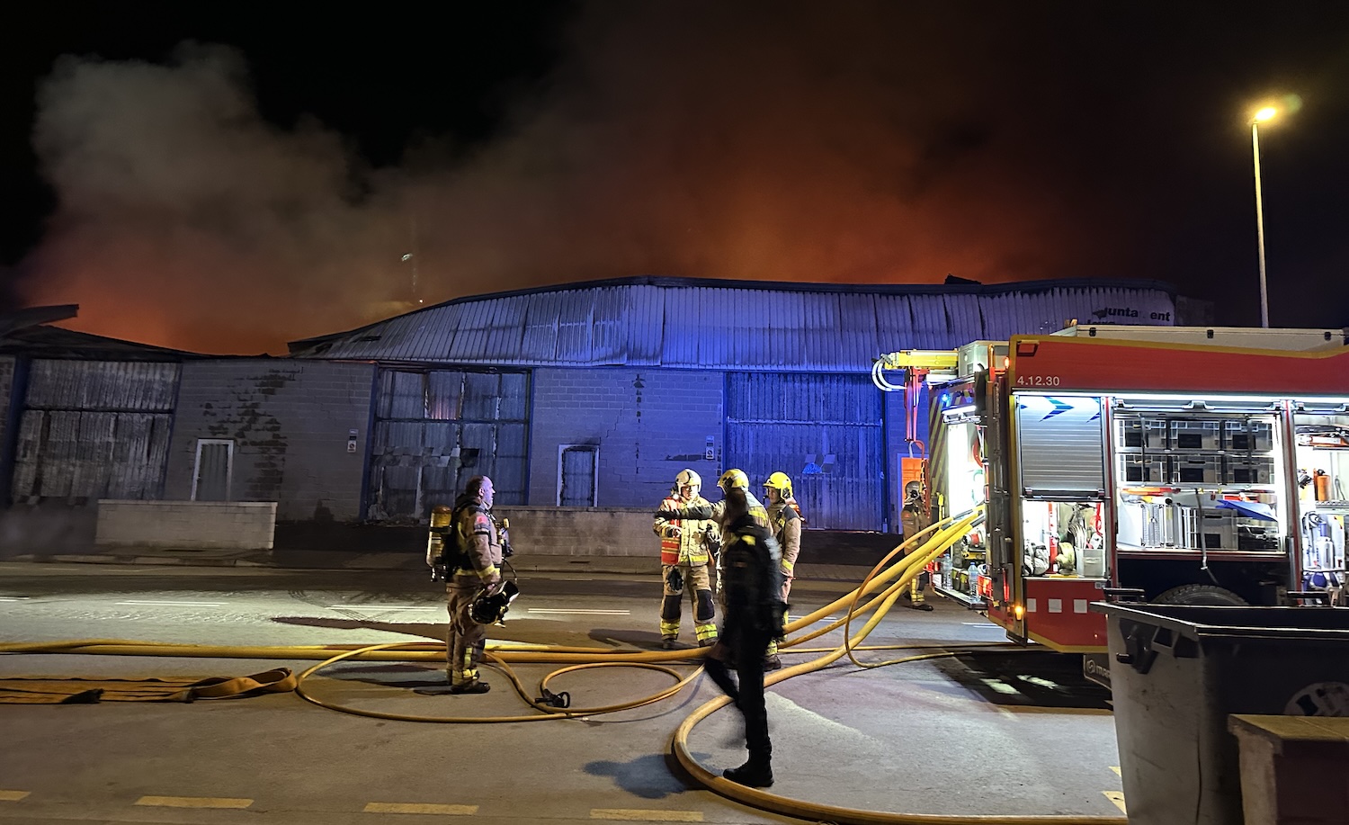Disset dotacions dels Bombers de la Generalitat van participar en les tasques d'extinció, que fins a quarts de dues de la matinada no van aconseguir controlar les flames. Durant tota la nit, han continuat els treballs de control i vigilància, i en aquests moments, encara crema una bateria a l'interior d'una de les naus. El cos de Bombers calcula mantenir fins a la tarda les tasques fins a garantir l'extinció total de l'incendi. Durant tota la nit i aquest matí, sis agents de la Policia Local treballen per reorganitzar el trànsit a la zona industrial i per garantir que ningú s'apropa fins als magatzems.