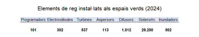 Algunes dades de la infraestructura de reg instal·lada en els espais verds:
